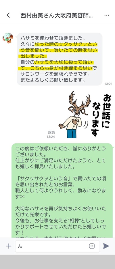 埼玉県の美容師 高橋大輝さんから嬉しいお言葉いただきました 前回裏スキをしていただいて、とても切れ味が良くなりました。 ありがとうございました。