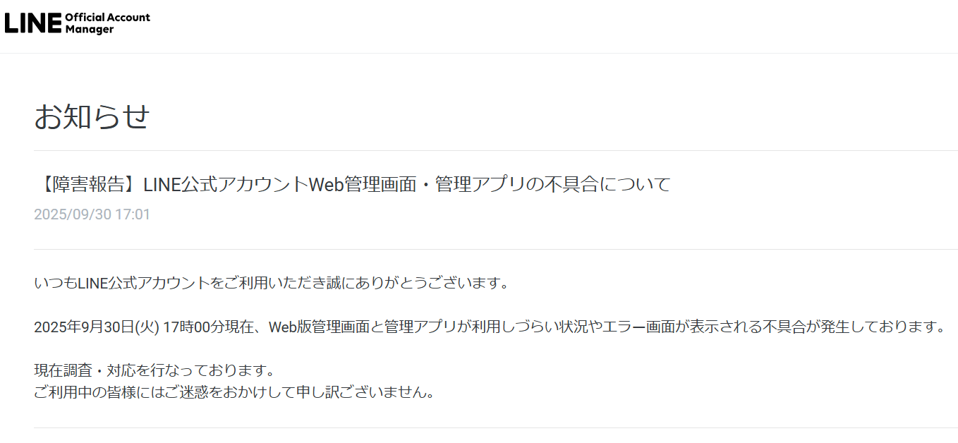 なお、当該期間中に予約されていたメッセージ配信とLINEユーザーからのチャット受信は正常にされております。