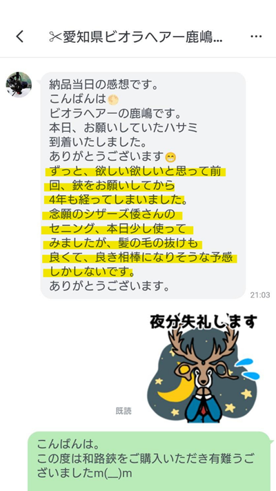 愛知県ビオラヘアー鹿嶋光敏さんから嬉しいお言葉いただきました