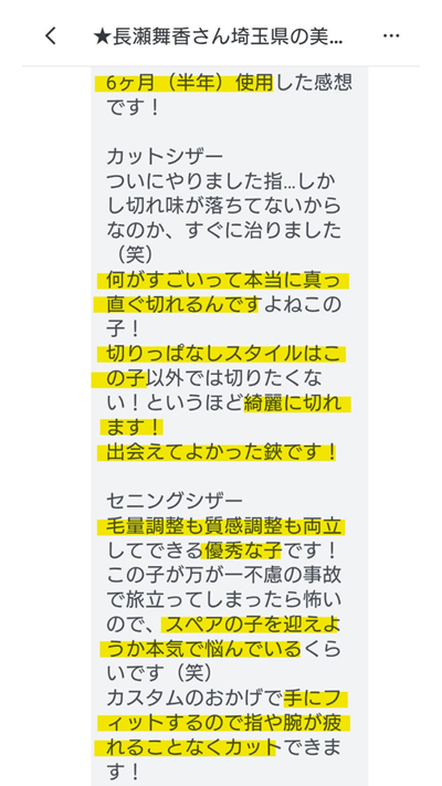 埼玉県の美容師 長瀬舞香さんから嬉しいお言葉いただきました