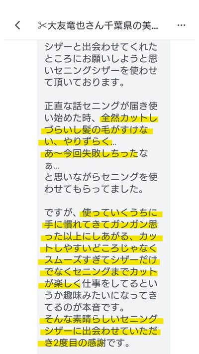 メンズのお客様が増えセニングシザーを探しておりこちらでシザーを購入させて頂きそちらを使わせてもらってカットしやすく、かつカットが楽しくなるなんてシザーと出会わせてくれたところにお願いしようと思いセニングシザーを使わせて頂いております。