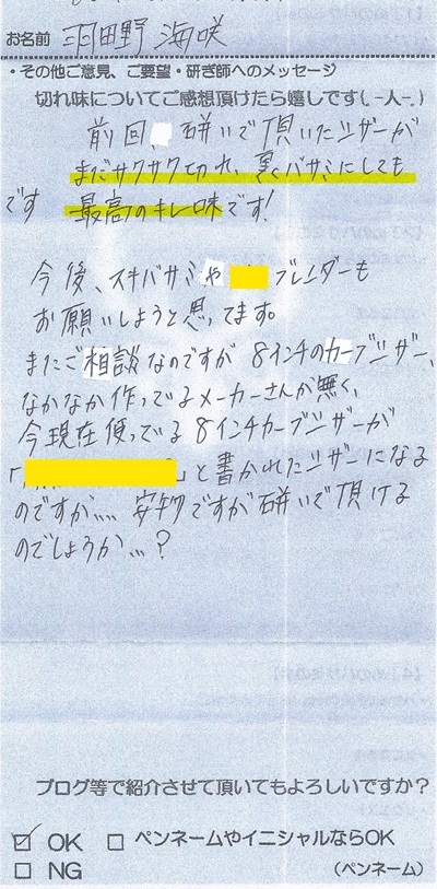 ■またご相談なのですが、8インチのカーブシザー、なかなか作っているメーカーさんが無く、今現在使っている 8インチカーブシザーが「XXXXXXXXX」と書かれたシザーになるのですが… 安物ですが研いで頂けるのでしょうか…?