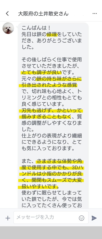 元々の鋏の持ち味がさらに引き出されたような感覚で、切れ味も心地よく、トリミングとの相性もとても良く感じています。