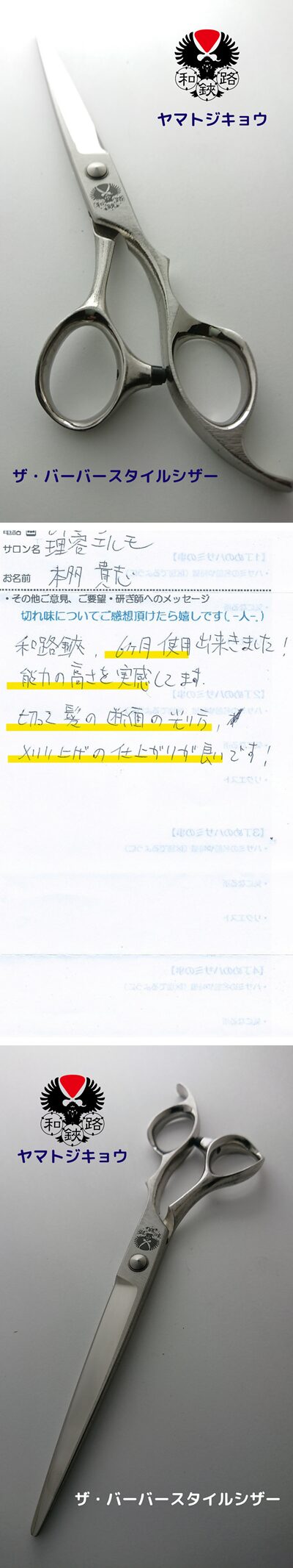 〜 和路鋏・ yamatojikyo 〜 伝説は始まっています 東京都 理容エルモ 本多貴志さんから嬉しいお言葉いただきました 【和路鋏・コアカットシザー】 【鋼材】 レアパウダーメタル 【サイズ】 65サイズ 【ハンドル】 3DオフセットSハンドル 【表面仕上】 ワイルド…