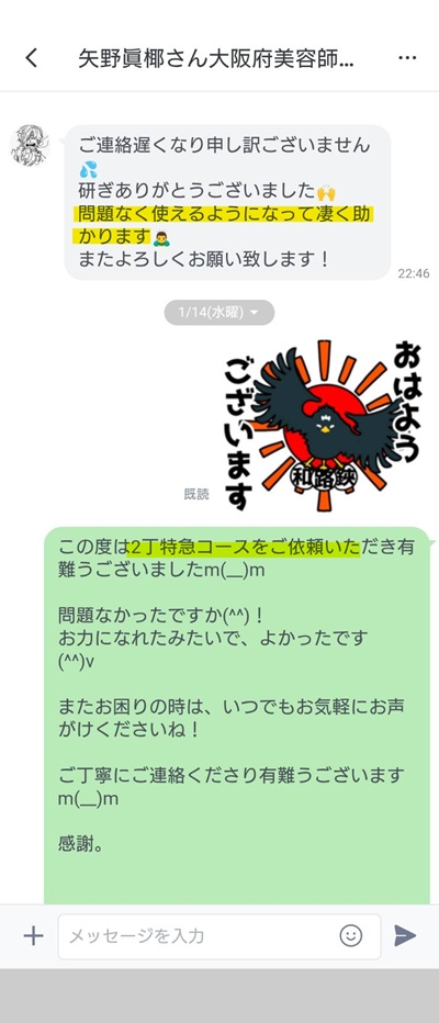 大阪府の美容師 矢野眞椰さんから嬉しいお言葉いただきました