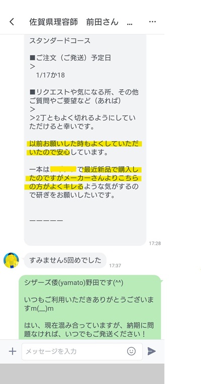 一本は〇〇〇〇で最近新品で購入したのですがメーカーさんよりこちらの方がよくキレるような気がするので研ぎをお願いしたいです。