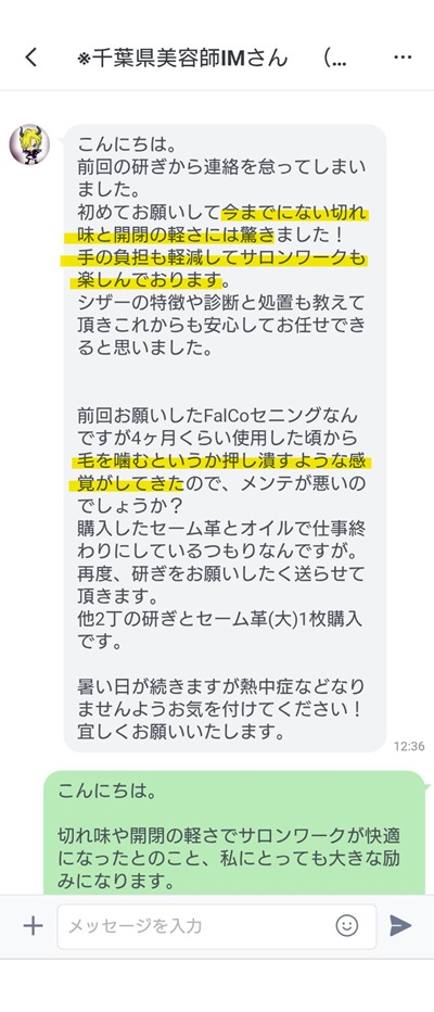 切れ味や開閉の軽さでサロンワークが快適になったとのこと、私にとっても大きな励みになります。