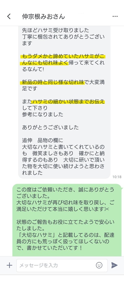 大切なハサミが再び切れ味を取り戻し、ご満足いただけて本当に嬉しく思います✂