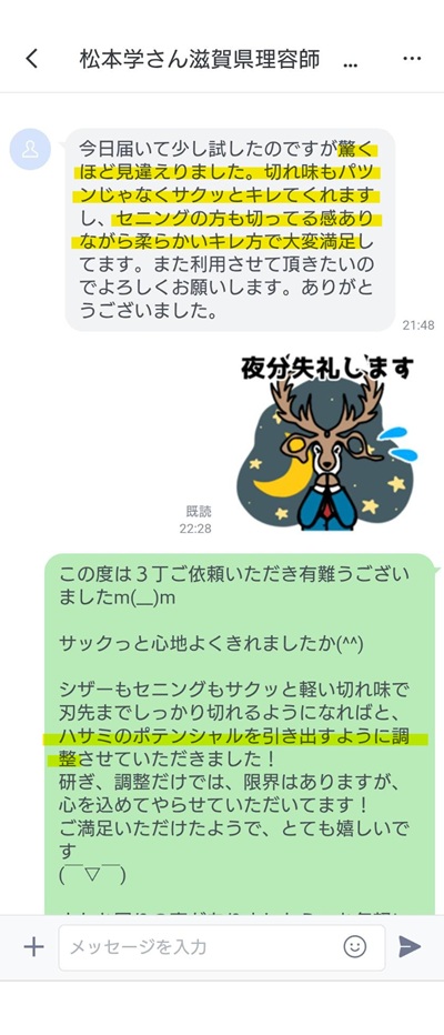 今日届いて少し試したのですが驚くほど見違えりました。切れ味もパツンじゃなくサクッとキレてくれますし、セニングの方も切ってる感ありながら柔らかいキレ方で大変満足してます。また利用させて頂きたいのでよろしくお願いします。ありがとうございました。