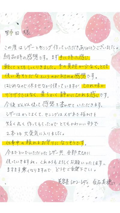 今までといでいただいたシザー共、全部大切に 使っていきますね。これからもよろしくお願いいたします。。 ますます寒くなりますので、どうぞご自愛下さいます。白石美穂