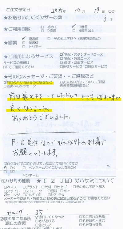ご注文書に前回のご感想をご記載いただき有難うございましたm(__)m