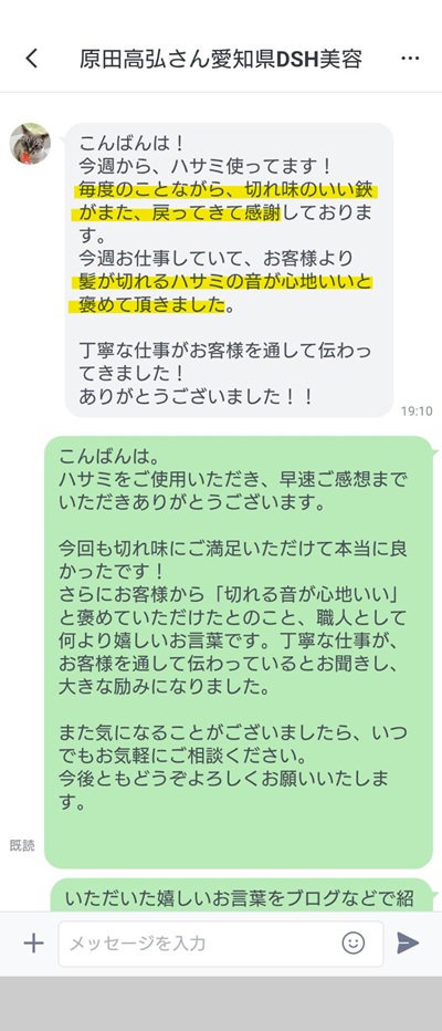 愛知県D.S.H HAIR原田高弘さんから嬉しいお言葉いただきました