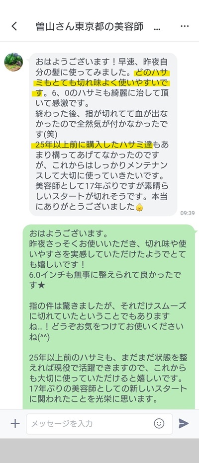 25年以上前に購入したハサミ達もあまり構ってあげてなかったのですが、これからはしっかりメンテナンスして大切に使っていきたいです。美容師として17年ぶりですが素晴らしいスタートが切れそうです。本当にありがとうございました(ありがとう)