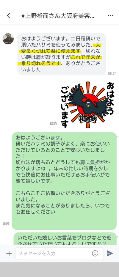 研いだハサミの調子がよく、楽にお使いいただけているとのことで安心いたしました!