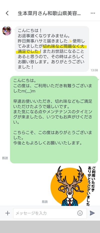 昨日無事ハサミ届きました✨使用してみましたが切れ味など問題なく大満足でした!またお世話になることあると思うので、その時はよろしくお願い致します。ありがとうございました!