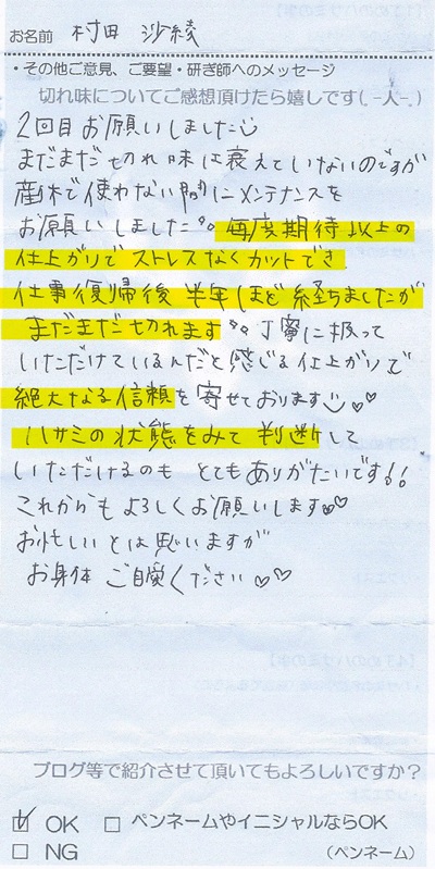 メンテナンスをさせていただいたハサミが日々のサロンワークのお役に立てていることが何よりも嬉しいです。ハサミの状態を私に任せてくださり、こちらこそ感謝です。