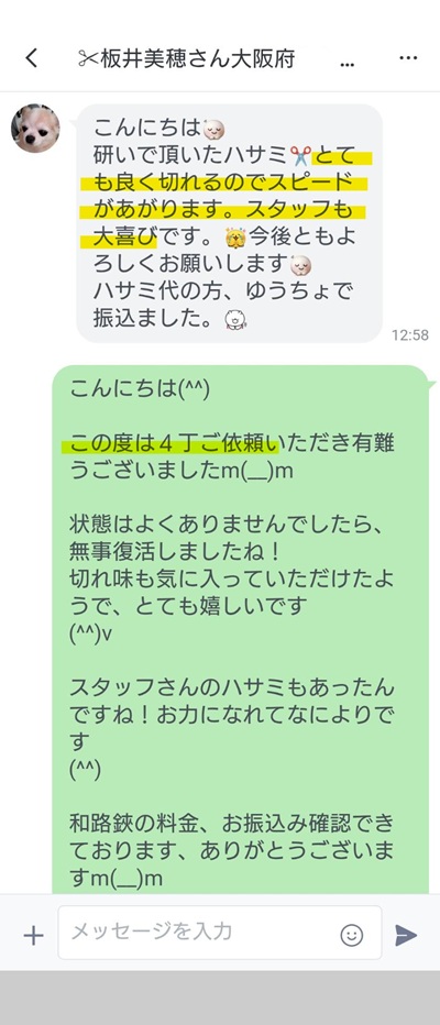 和路鋏の料金、お振込み確認できております、ありがとうございますm(__)m