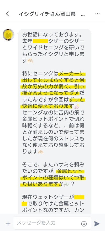 お世話になっております。去年〇〇〇シザーのシザーとワイドセニングを研いでもらったイシグリと申します(emoji)