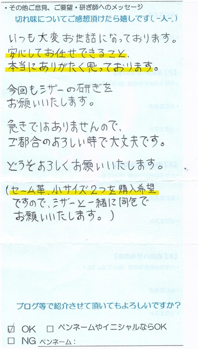いつも大変お世話になっております。安心してお任せできること、本当にありがたく思っております。今回もシザーの研ぎをお願いいたします。