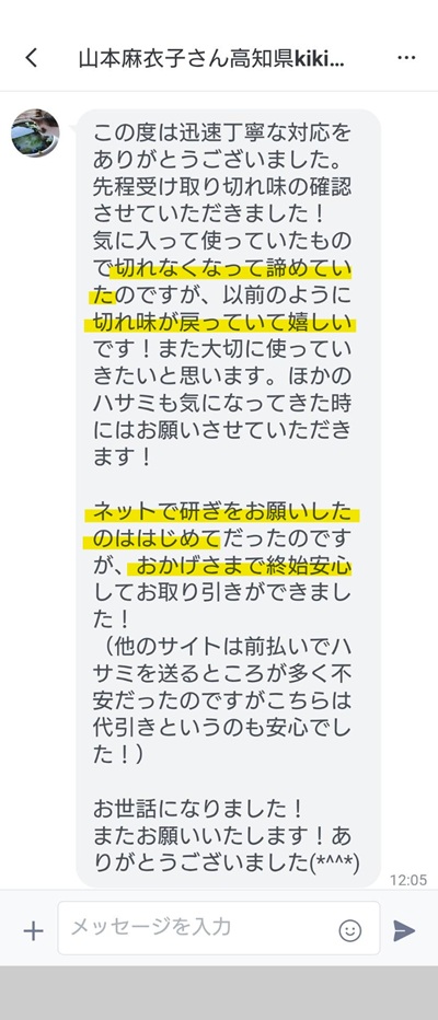 ネットで研ぎをお願いしたのははじめてだったのですが、おかげさまで終始安心してお取り引きができました!