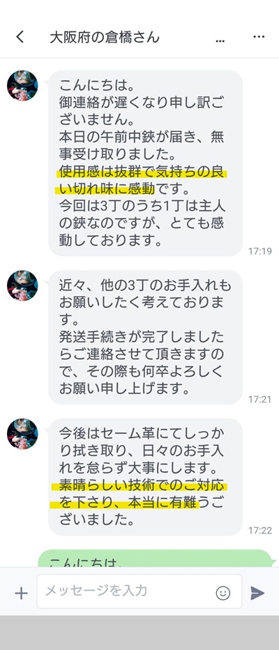 使用感も抜群とのこと、気持ちの良い切れ味に感動していただけたようで